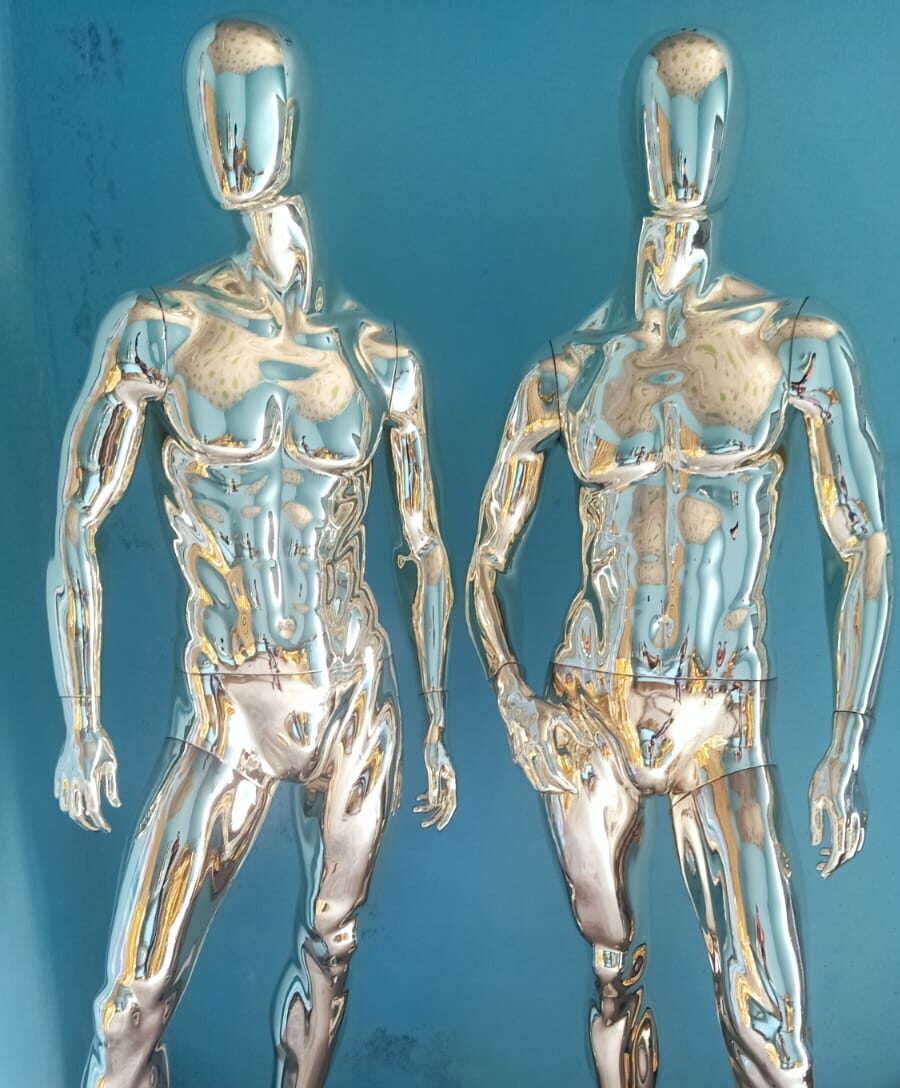Stunning chrome-finished male mannequins with a reflective surface, perfect for modern retail displays and artistic showcases.