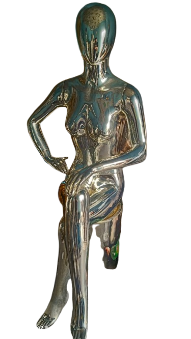 Showcase your apparel or accessories with elegance using our Sitting Women Chrome-Plated Mannequin. Crafted from durable fiberglass and finished with a reflective chrome plating, this mannequin offers a futuristic, high-end look that grabs attention instantly. The seated pose is ideal for displaying outfits in window setups, furniture-based displays, or creative fashion arrangements.